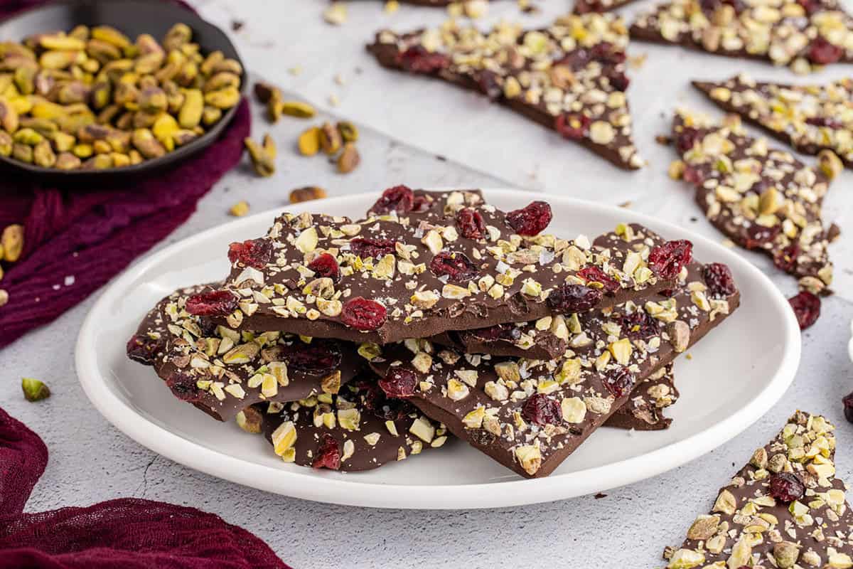 This Dark Chocolate Bark is rich, snappy and perfectly balanced with salty pistachios and tart dried cranberries. The dark chocolate sets with a smooth, glossy finish that cracks beautifully with every bite.